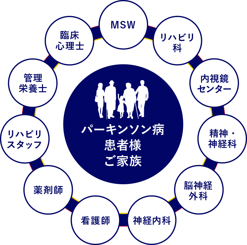本センターでは、“パーキンソン病に対するチーム医療を推進し、安心・安全に最適かつ先端的な医療を提供し、多職種でパーキンソン病患者さんの健康を支える”ことを理念として掲げています。神経内科、脳神経外科、リハビリテーション科、精神・神経科、内視鏡センターといった複数の診療科、看護師、薬剤師、リハビリスタッフ、臨床心理士、管理栄養士、医療ソーシャルワーカーといった多くの医療職種が、それぞれの持つ専門知識と技術を活用しながらチーム内で目標・情報を共有し、パーキンソン病患者さんやそのご家族の健康を支えています。